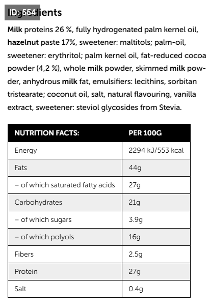 بروتينات الحليب 26%، معجون البندق 17%، مُحلي: مالتيتول؛ مُحلي: إريثريتول؛ مسحوق الكاكاو قليل الدسم (4.2%)، مسحوق الحليب كامل الدسم، مسحوق الحليب منزوع الدسم، دهن الحليب اللامائي ، مستحلبات: الليسيثين، ثلاثي ستيرات السوربيتان؛ زيت جوز الهند، ملح، نكهة طبيعية، خلاصة الفانيليا، مُحلي: جليكوسيدات ستيفيول من ستيفيا.